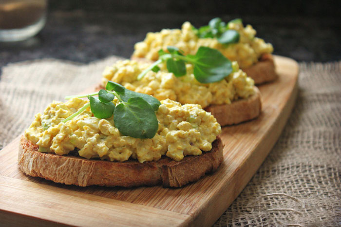 The egg salad is a zesty twist which offers a very healthy way of working eggs for lunch. The low fats Greek yogurt may be used in place of mayonnaise. It helps in cutting down the calories and fats while curry powder offers a jolt of rich antioxidants.