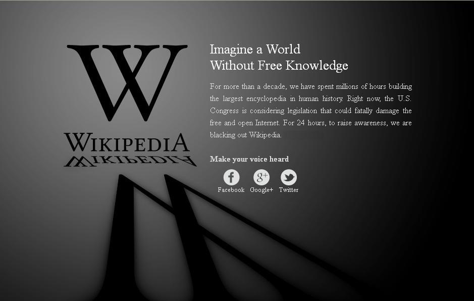 From their page – “For over a decade, we have spent millions of hours building the largest encyclopedia in human history. Right now, the U.S. Congress is considering legislation that could fatally damage the free and open Internet. For 24 hours, to raise awareness, we are blacking out Wikipedia,”.